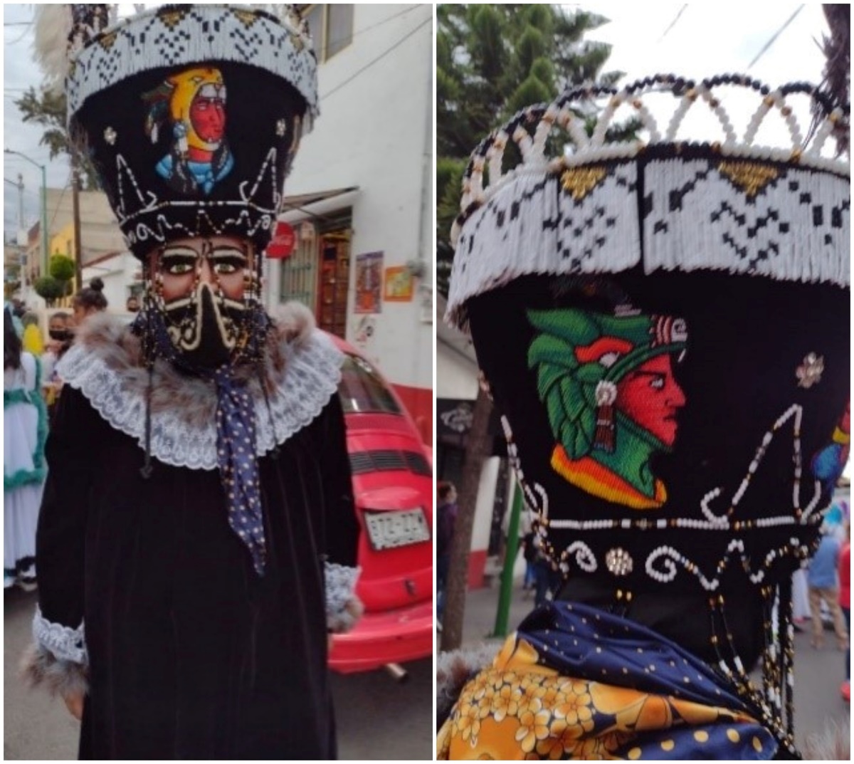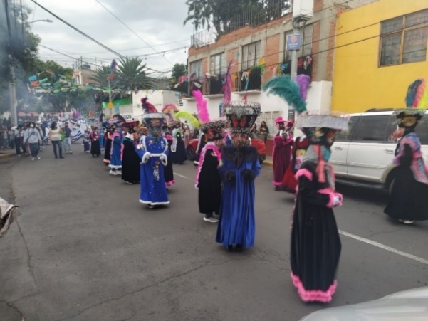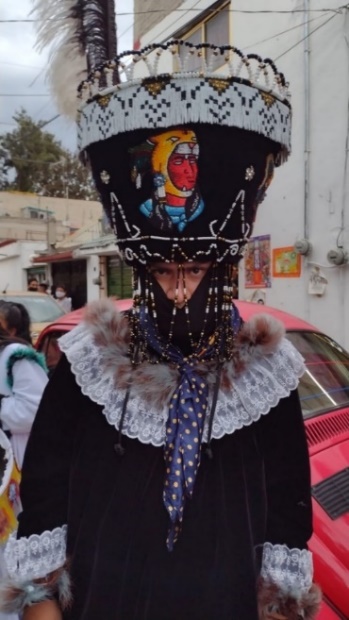 Fotografía de Diana elena Barcelata Eguiarte (2022).El atuendo de los miembros de la Comparsa mantiene en sus signos icónicos la tradición de incluir motivos de la cultura prehispánica, inspirados en el estilo denominado “elegante”