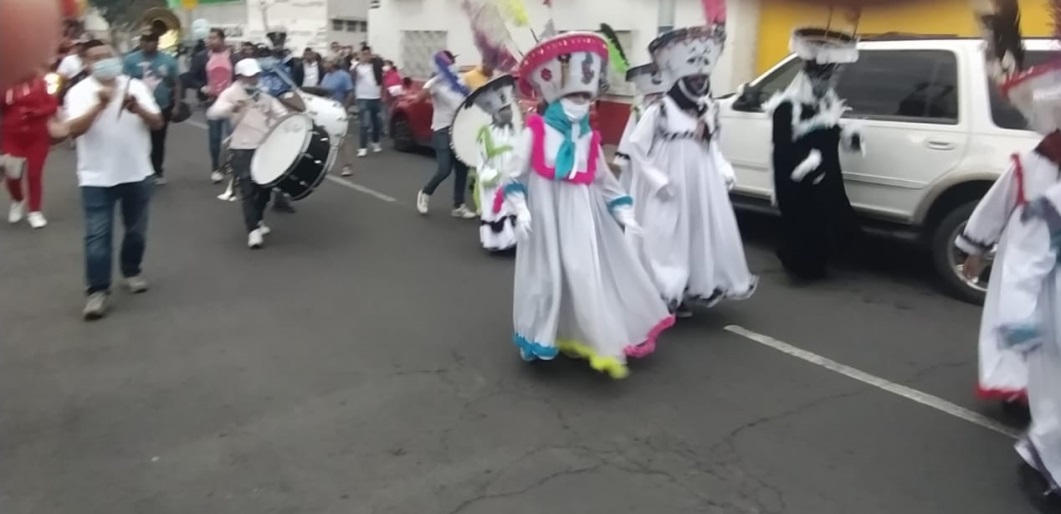 comparsas de chinelos durante el recorrido de la catedral de San Bernardino de Siena a la casa de la mayordomía, ubicada en el Barrio de San Marcos.