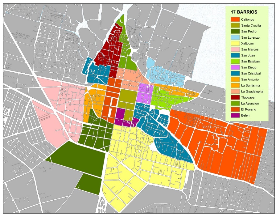 En el presente apartado se explicitan las relaciones dialógicas inter barriales, en su comunión con la religiosidad y las comparsas de los chinelos, cuyas manifestaciones se representan en las calles de los barrios como espacios escénicos. Se muestra, a partir de la construcción narrativa, el significado que tiene ser parte de la comparsa de los chinelos al representar a un Barrio o Pueblo de Xochimilco. Se coincide con Peralta al considerar cómo el espacio urbano, mediante sus barrios y calles, se convierte temporalmente en espacio sagrado ante las manifestaciones de veneración a imágenes como el Niñopa, y otras imágenes religiosas (2011). La zona centro, integrada por 17 barrios ubicados en el centro histórico y sus alrededores, son el epicentro de las festividades religiosas y de las prácticas simbólicas. La parte más antigua de la Alcaldía Xochimilco la conforman los barrios de Xaltocán, Belén, Caltongo, El Rosario, La Guadalupita, La Asunción, La Santísima, San Antonio, San Cristóbal, San Esteban, San Diego, San Juan, San Marcos, San Lorenzo, San Pedro, Santa Crucita y La Concepción (Figura 4).