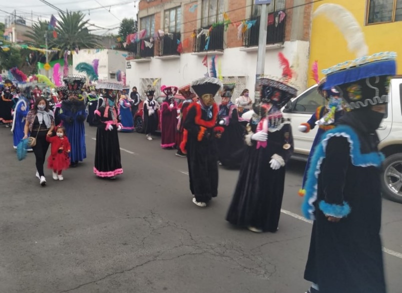 Fotografía de Diana Elena Barcelata Eguiarte (2022).Procesión de la comparsa “la Misteriosa” con otras que se dirigen hacia la nueva morada del Niñopa en el Barrio de San Antonio.