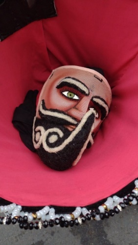 Fotografía de Diana Elena Barcelata Eguiarte (2022).“Pues los chinelos y el brinco, eso no ha cambiado, todos aquí sabemos que los chinelos tienen sus orígenes en los huehuenchis. La cosa es que los chinelos pasaron a ser de costumbre a tradición, y después patrimonio cultural. Las máscaras que se han utilizado por los chinelos son iguales en los rasgos, como los ojos azules, y son blancos y con cara roja (Figura 7), como los españoles que nos conquistaron, se caracterizan por tener la barba picuda para exagerar, así como todo es exagerado” (Ríos,2022).