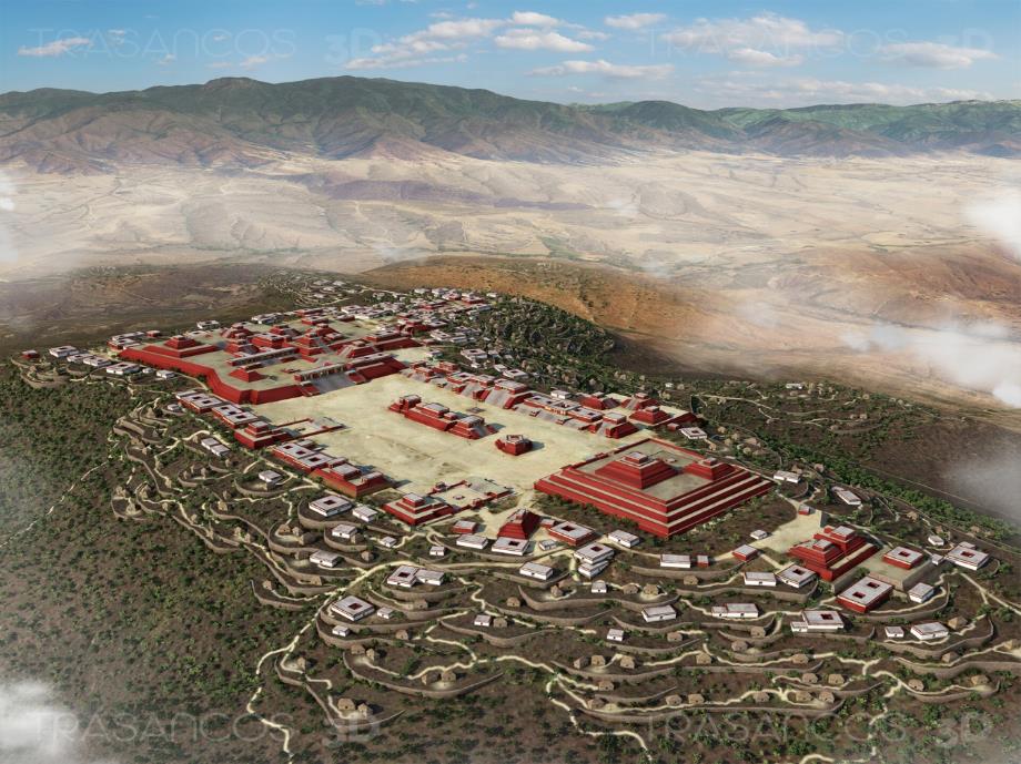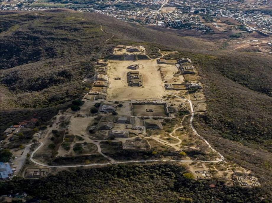 Los escalonamientos naturales que se miran por debajo de la acrópolis están entreverados por numerosos arroyos que descienden al rio Guisi. En la planicie aluvial se encuentra una zona muy amplia dedicada a la agricultura, por donde ingresaban a la ciudad los comerciantes de las tierras meridionales. El segundo acceso se localiza sobre la vía que comunica a la acrópolis con los valles centrales. Los ámbitos ritual-ceremoniales empleados por las élites ocupan la cumbre y las laderas del Cerro de la Cruz y la Plaza, donde se hallan extensas áreas habitacionales. La zona de los mercados abarca el sector central, e incluye diversos planos integrados funcionalmente. En su costado occidental se extiende un espacio con numerosas estructuras monumentales, y del lado opuesto un probable ‘puerto de intercambio’ para los grandes mercaderes del Altiplano y las tierras bajas mayas.