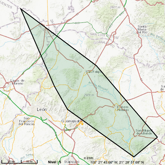 4. San José del Tanque: 101º 30’ 38.08” W, 21º 20’ 35.62” N, 2,330. Este punto corresponde a una población sobre la carretera León a San Felipe, en un área baja de un valle al oriente de áreas montañosas al NE de León. En tanto que no hay glosa, la ubicación de este vértice es más tentativa por sustentarse en la pictografía de la región.