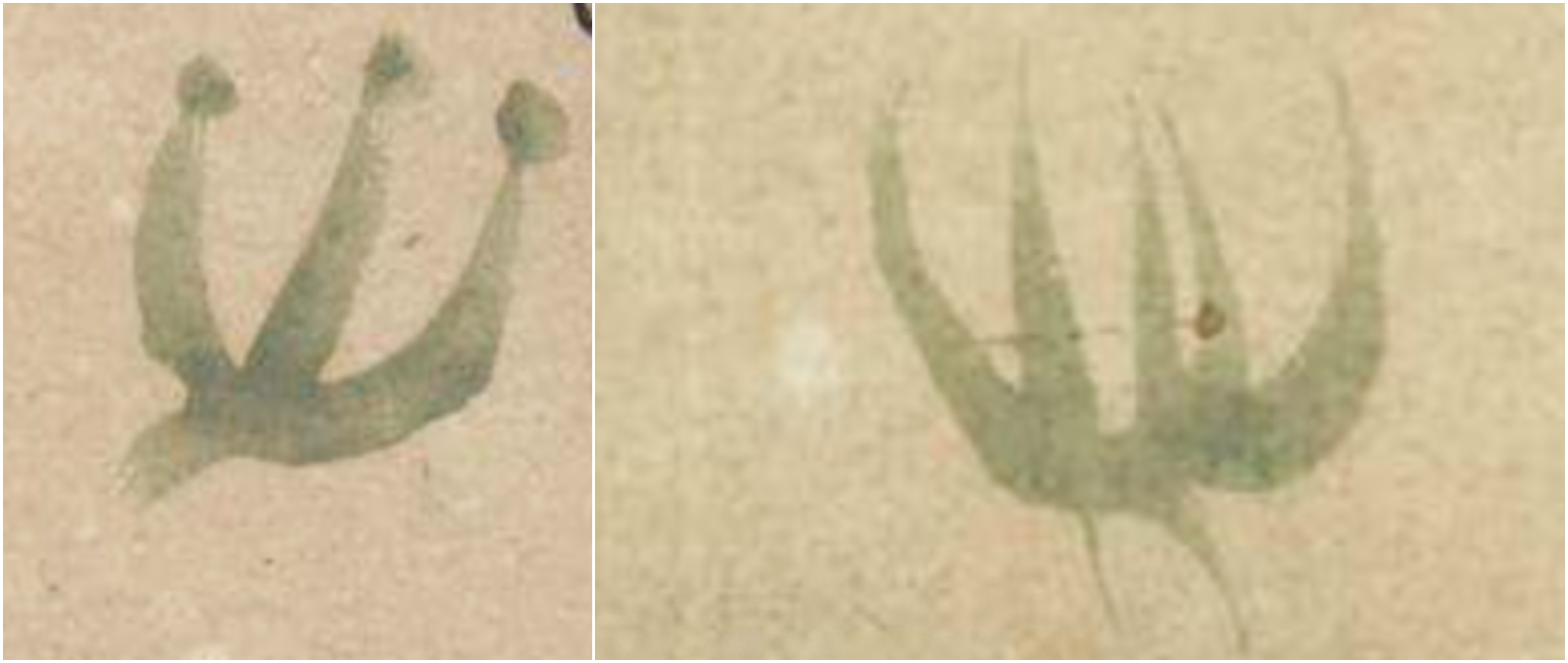 Los pastizales son el tipo de vegetación con mayor extensión en el documento (superficcie de color amarillo claro). Hay más de 60 iconos (Figura 3) que representan a los pastos, en ocasiones cercanos a ojos de agua que sugieren áreas de ciénagas y algunas veces cerca del hocico de animales domésticos, lo que sugiere su consumo como forraje. Butzer & Butzer (1993, p. 117), a su vez asocian a estos numerosos iconos con magueyes (Agave spp.. y no con pastos u otras herbáceas. No obstante la relevancia cultural de los magueyes, su interpretación iconográfica se contradice, al menos, con argumentos: (1) morfológicos, pues las figuras redondas en el extremo de lo que ellos suponen las pencas pueden corresponder a las estructuras florales terminales de la vegetación herbácea (inflorescencias en el caso de los pastos); tampoco la esfera en el extremo corresponde a la típica inflorescencia columnar de los magueyes; (2) ecológicos, pues las imágenes de ganado junto a esta vegetación sugieren pastoreo (Figura 4); (3) fitogeográficos, ya que en la región estudiada no hay condiciones favorables para la amplia distribución de comunidades con predominio de magueyes de bajo porte y no aptas para el pastoreo, conocidas como “lechuguillales” de Agave lechuguilla, que se distribuyen más ampliamente en el norte de Zacatecas y San Luis Potosí, así como en Nuevo León, Coahuila, Chihuahua e hidalgo, el norte semiárido del valle de México (Miranda & Hernández X., 1963; Rzedowski, 1978); y (4) históricos, pues Butzer & Butzer (1993, p. 104) asocian la presencia de magueyes ferales (al menos los de gran porte) con sitios en los que se practicó la agricultura tradicional, la cual no practicaban los pueblos originarios de la región antes del contacto en el siglo XVI.