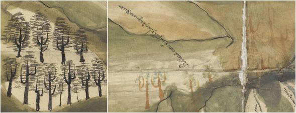 En las áreas más secas los bosques son más bajos (< 8m), con Q. eduardi (Bartholomew & Almeda, 2023), Q. grisea, Q. potosina y pino piñonero (P. cembroides), y hacen contacto con asociaciones de matorrales desérticos y pastizales semidesérticos. En las regiones más altas y húmedas predominan Q. rugosa, Q. obtusata, Q. crassifolia . Q. laurina, junto con P. montezumae, P. pseudostrobus. P. teocote. En varias partes de la pintura se muestran iconos de árboles con una variada paleta de colores, que sugiere los bosques más oscuros para representar los de mayor elevación (Figura 5).