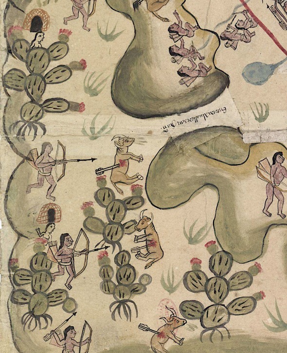 En el lado izquierdo y a lo largo de la parte inferior del cuadrante C del códice estudiado, destaca la representación continua de vegetación de nopalera (Miranda & Hernández X., 1963), como hábitat más o menos permanente de los pobladores chichimecas y al que se asocian la mayoría de las imágenes de fauna silvestre. Se trata de un sistema natural con predominio de especies del género Opuntia (Cactaceae) en el que las relaciones de herbivoría y frugivoría, así como de depredación y dispersión de las semillas, tanto por los vertebrados nativos, incluida la especie humana, como por supuesto también con todos los ungulados introducidos al Nuevo Mundo en el siglo XVI, pueden determinar de manera mutua sus respectivos patrones de distribución y abundancia (González-Espinosa, 1982; 1999; González-Espinosa & Quintana-Ascencio 1986; Janzen 1986; Rivera Villanueva et al. 2019). La fenología floral y de fructificación de las especies de Opuntia (en conjunto, y para todas las especies coexistentes en una localidad dada) puede abarcar desde marzo a principios de diciembre. A diferencia de otros tipos de vegetación, en la nopalera la mayor proporción de tejido vegetal, así como la producción de frutos y semillas disponibles en un año dado, dependen menos de la cantidad de lluvia del año en curso que de la del año precedente (González-Espinosa, 1982; 1999). De manera adicional a los recursos dependientes de la estación lluviosa en curso, esta relativa independencia de la fenología de los nopales silvestres, en la medida que estos determinan la mayor parte de la biomasa vegetal en el sitio, puede ofrecer a los organismos que habitan las nopaleras, incluidos los humanos, una mayor estabilidad anual e interanual en la disponibilidad de alimento (González-Espinosa, 1999).