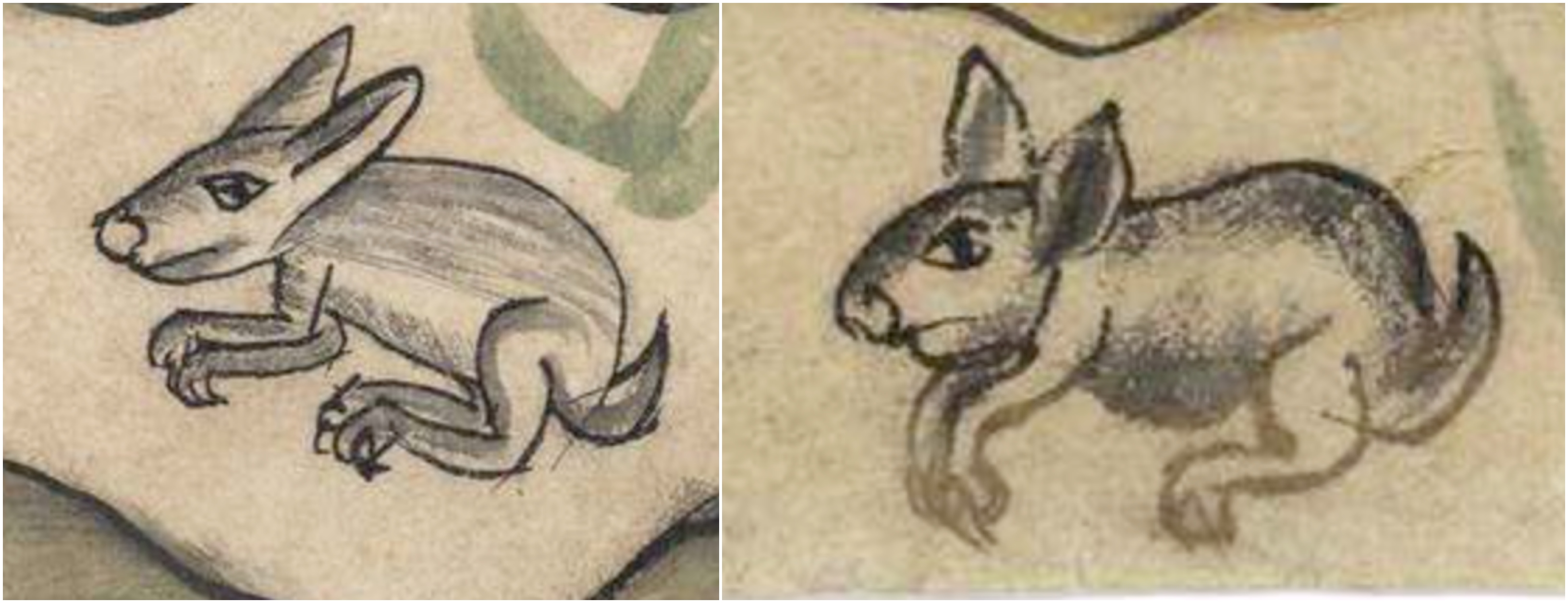 Algunas representaciones en la pintura no implican ambigüedad, pero otras sí. Entre las primeras se pueden proponer la del coyote, Canis latrans (Naturalista 2022c), el venado cola blanca, Odocoileus virginuanus (Naturalista 2022d) y quizá la liebre de cola negra, Lepus californicus (Naturalista 2022e). Esta última se podría distinguir del conejo serrano, Sylvilagus floridanus (Naturalista 2022f) o del conejo del desierto (S. audubonii; Sánchez 2014) en el icono que aparece en la orilla inferior del cuadrante D, si se acepta para estas últimas especies un tamaño relativamente menor del cuerpo y de las orejas que en la “liebre” (Figura 8).