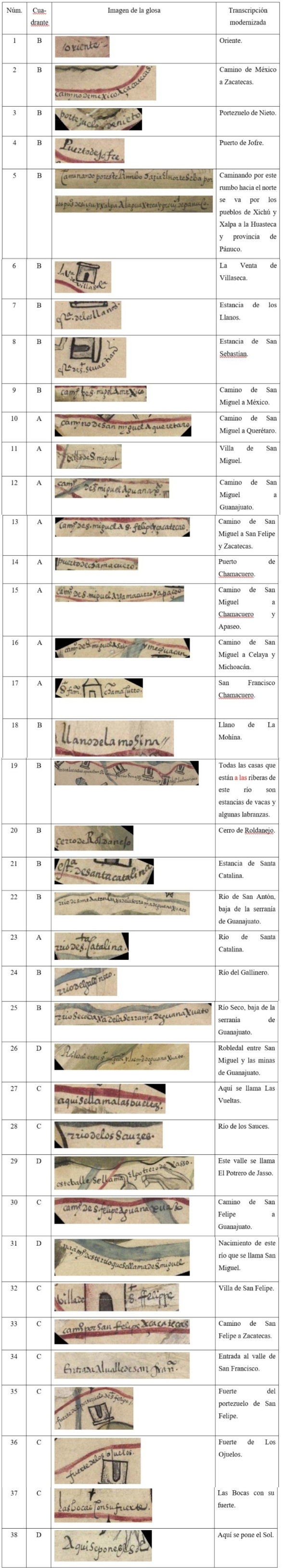 Por otra parte, debido a la naturaleza pictórica del códice, hay un claro predominio de elementos figurativos y conceptuales que pueden ser comprendidos independientemente de la lengua o lenguas que hable el autor, y la de los receptores, sin que emisor y destinatario compartan un mismo idioma. El análisis iconográfico es un método que permite no sólo identificar las figuras, sino acercarse a su significado. Hay imágenes que se inscriben dentro de la tradición mesoamericana, como las figuras de los chichimecas o de la flora y fauna nativas, mientras que otras plasman elementos de la nueva realidad: entidades administrativas, caminos para carretas, y fauna introducida son elementos presentes en el MSMySF en el que las representaciones esquematizadas de fachadas de iglesias sustituyen a los topónimos jeroglíficos6. El estudio de las imágenes permite reconocer contenidos e identificar conceptos, que junto con las glosas, brindan información detallada y precisa, a la vez que acercan al lector-observador a su significado. Así, mediante la conjunción de imágenes y glosas es posible registrar distintos puntos y áreas de la región representada, con sus elementos constitutivos: montañas, valles, ríos, ojos de agua, así como estancias, fuertes y asentamientos permanentes. Además, en este manuscrito pictográfico del norte de Guanajuato hay una dimensión temporal múltiple, asincrónica, integrada con el paisaje. Se trata de seis escenas en las que chichimecas y españoles aparecen en diferentes parajes, y que se pueden asociar con hechos que ocurrieron a lo largo de los veinte años anteriores a la elaboración de la primera versión del documento7. Las glosas completas, en su forma modernizada, se muestran en el Cuadro 4.