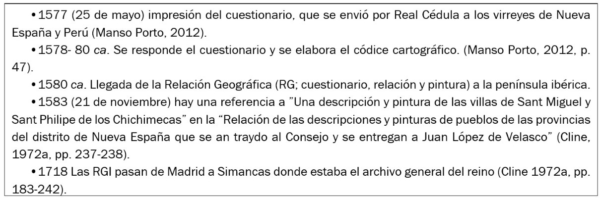 Cline, H. F. (1972). The Relaciones Geográficas of the Spanish Indies, 1577-1648. En H. F. Cline (Ed.). Handbook of Middle American Indians, vol. 12, Guide to Ethnohistorical Sources, Part I, pp. 183-242, University of Texas Press.