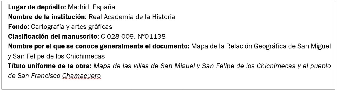 La Real Academia de la Historia (Madrid) resguarda en su sección de Cartografía y Artes Gráficas un documento registrado con la signatura C-028-009. Se trata del manuscrito denominado Mapa de las villas de San Miguel y San Felipe de los Chichimecas y el pueblo de San Francisco Chamacuero1. que corresponde, parcialmente, al actual estado de Guanajuato, con porciones adjuntas, en su parte norte y noroeste, de los estados de Jalisco, Aguascalientes, Zacatecas y San Luis Potosí, así como de Querétaro, en el este. Los municipios guanajuatenses que total o parcialmente se incluyen en el documento son: San Miguel de Allende, Dolores Hidalgo, Guanajuato (porción norte), San Felipe, Ocampo, San Diego de la Unión, San Luis de la Paz (parte occidental), y pequeñas porciones de Doctor Mora y San José Iturbide.