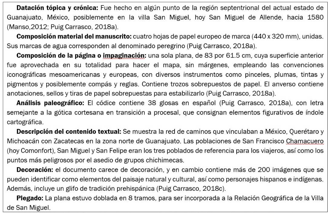 Puig Carrasco, A. (2018a). “Análisis codicológico del mapa de la Relación Geográfica de San Miguel y San Felipe de los Chichimecas”. En J. J. Batalla Rosado; de Rojas & J. L. Pérez Lugones (Eds.) Códices y cultura indígena en México. Homenaje a Alfonso Lacadena García-Gallo, pp. 287-314. DistintaTinta.