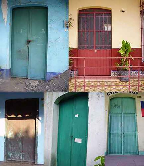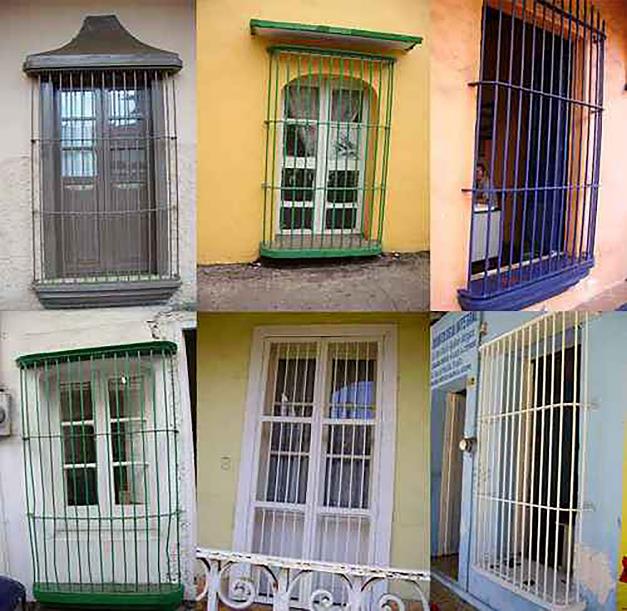 Los puertas están construidas con dos hojas abatibles de madera (Figura 10). Las ventanas son también de dos hojas abatibles de madera, pero en tableros y con vidrio. Los vidrios originales tienen un bisel perimetral. Las protecciones son hechas de barrotes verticales; anteriormente eran de madera torneada, pero algunas de ellas, con el paso del tiempo, fueron sustituidas por protecciones de herrería.