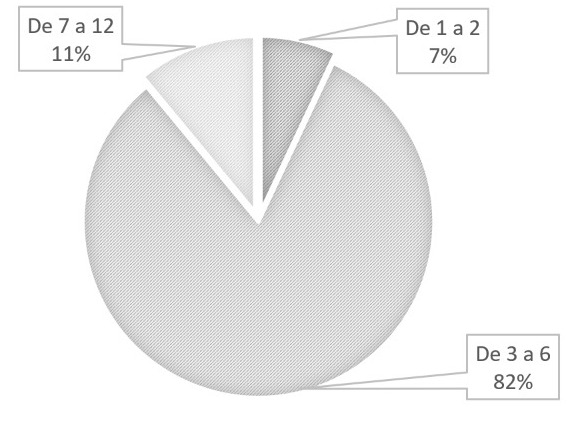 Los vanos tienen una proporción vertical (Figura 8). El número de vanos de la fachada principal es la siguiente: en un 82% de las construcciones hay de tres a seis vanos, y un 11% tiene más de siete vanos (Figura 9). Durante el recorrido en sitio, se encontró que en la parte superior existen dinteles de tabique y madera debajo de los aplanados.