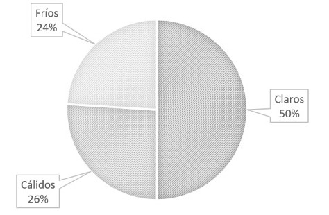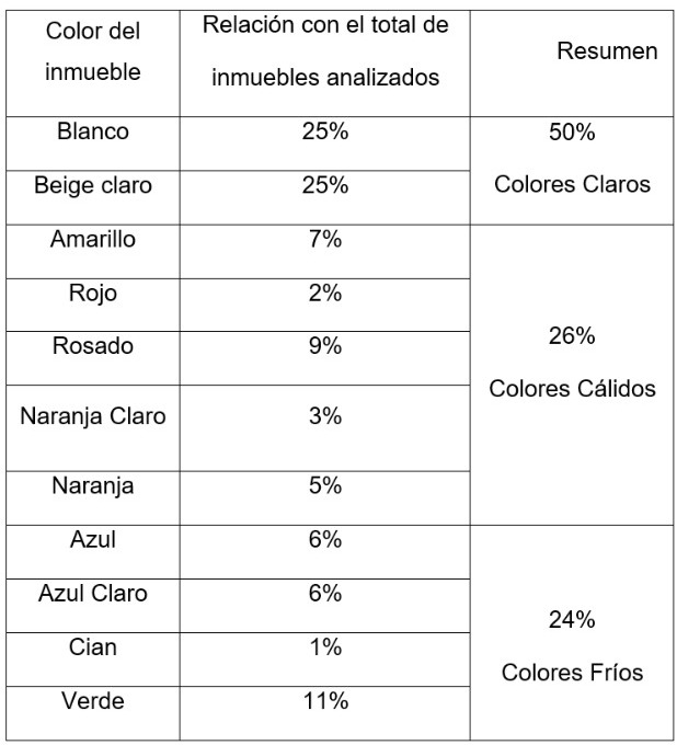 El analisis de color exterior dio como resultado que la mitad de los inmuebles estaban pintados de blanco o beige claro. En cuanto al uso de colores cálidos, la mayor incidencia es de los colores amarillo y rosado. En las tonalidades clasificadas como frias, más de la mitad ocuparon diferentes graduaciones del azul como color externo (Tabla 1 y Figura 11).