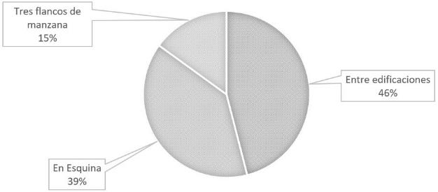 Al analizar la ubicación de las viviendas estudiadas con relación a la manzana que les contiene, se concluye que el 46% de estos inmuebles se ubica entre dos edificaciones contiguas; el 39% se encuentra formando una esquina de la manzana; y el restante 15% ocupa tres flancos de la manzana (Figura 2).