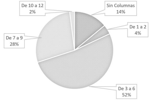 El analisis fortalece la afirmación de que la identidad constructiva se relaciona con las característica del número de columnas de los inmuebles tradicionales, la cual se resume de la siguiente manera: 52% de las construcciones tiene de tres a seis columnas en la fachada principal; un 24%, de siete a nueve columnas, y el 14% no posee columnas en su fachada (Figura 6).