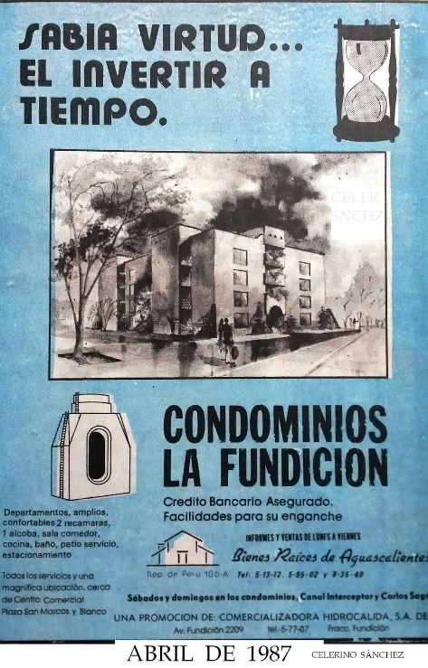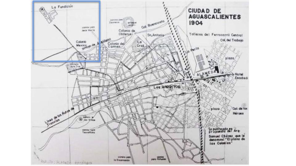 https://www.facebook.com/groups/lafundicionaguascalientesCon un recuadro azul se señala la Zona Fundición que, aunque en el momento de su realización incluía las viviendas obreras, en el plano demuestra que solo están representados polígonos que corresponden a los edificios productivos