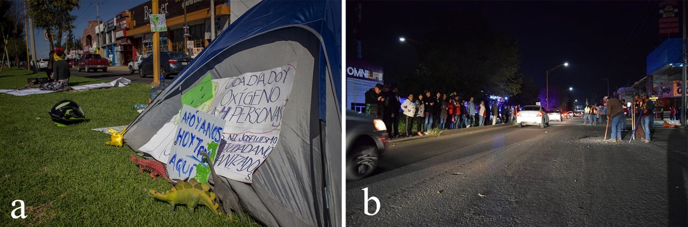 Otra de las manifestaciones en torno a la toma de decisiones en el territorio, fue detonada por este mismo proyecto de movilidad y tomó lugar en el año 2018, cuando unos días antes de empezar la construcción del paso a desnivel en Avenida Aguascalientes –una de las vías principales de la ciudad–, vecinos, comerciantes y ambientalistas de la zona montaron un campamento en el camellón (este sería derribado junto con más de 70 árboles que habían sido plantados al inicio de los desarrollos habitacionales de la Zona) (Figura 13).