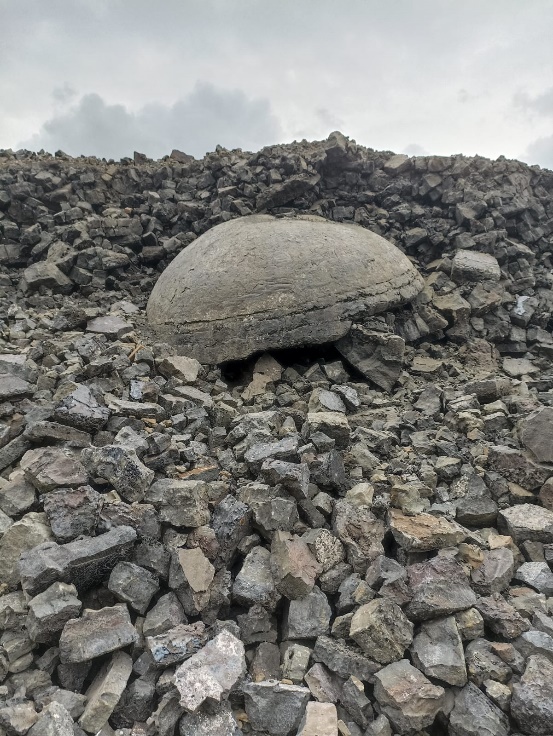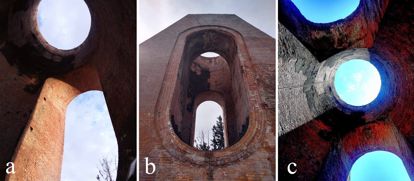 Fotografía de Alba Díaz Márquez, año 2021.asamento de la única chimenea que permanece en pie. Estas fotografías fueron proporcionadas por los miembros de la comunidad virtual de la red Facebook, quienes dan testimonios del estado actual de la zona. Las fotografías a y c fueron tomadas desde el interior de la chimenea; la marcada con la letra b retrata la fachada sureste del monumento.