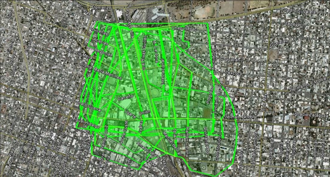 La segunda fase consistió en digitalizar cada uno de los polígonos resultantes y los elementos de importancia señalados, producto de la delimitación espacial del Centro Histórico utilizando Google Earth. Se utilizó la función "agregar polígono" y se modificó el grosor de las líneas y la opacidad del área.