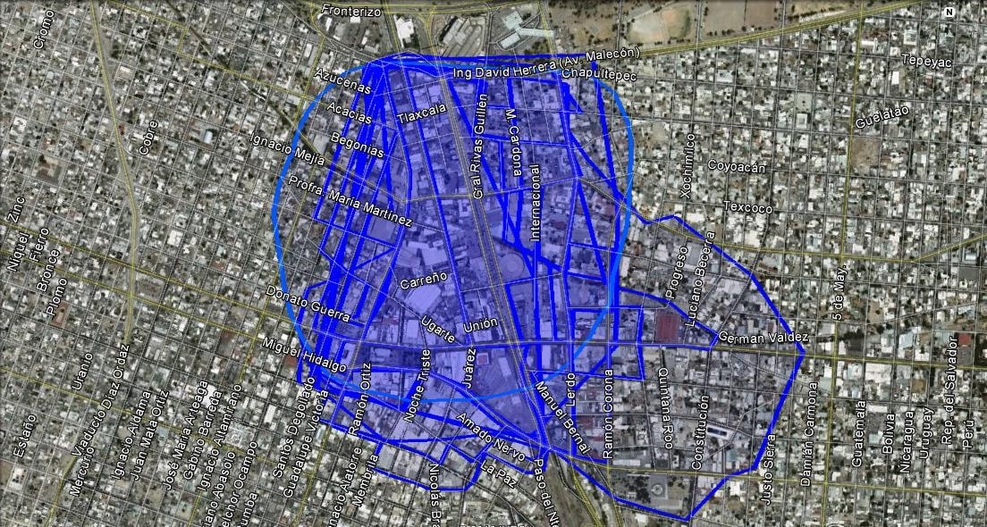 Finalmente, la tercera etapa denominada "límites difusos" se presenta como el principal aporte metodológico en este trabajo. Esta etapa no solo permitió establecer los límites espaciales del área, sino que también permitió ubicar un área de estudio generada a partir de la experiencia de vida de los 21 participantes en los grupos 1, 2 y 3. Este ejercicio no tiene precedentes en la delimitación social del CHCJ en la frontera, ofreciendo un contexto espacial sobre la zona que reside en la concepción de límites imaginarios diversos y extrapolados al plano físico.
