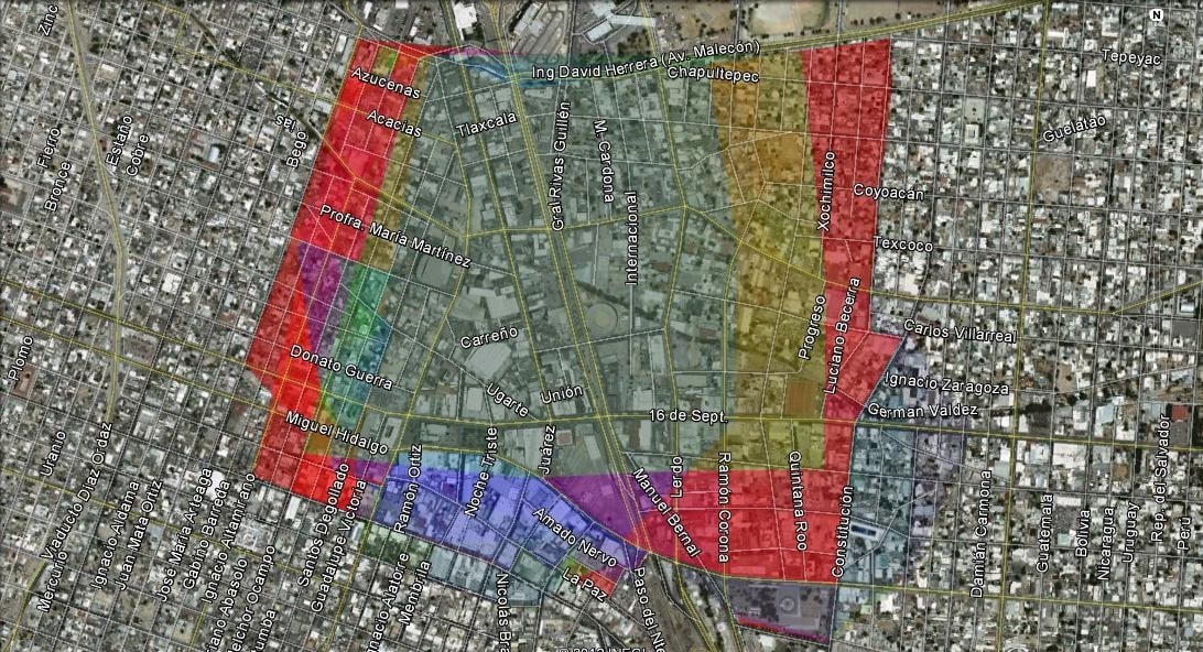 A continuación, se muestran las imágenes que contienen las diversas delimitaciones del centro histórico, iniciando con el grupo 1 de los actores entrevistados señalado en color rojo (ver figura 5), prosiguiendo con los grupos 2 en color verde (ver figura 6) y 3 en color azul (ver figura 7), siguiendo la teoría cromática de color. Las áreas en las cuales el color denota mayor intensidad se deben a la coincidencia de un mayor número de polígonos, siendo las áreas con menor intensidad de color, aquellas donde coinciden el menor número de polígonos, de los cuales, se aprecian sus límites a partir de las diversas líneas trazadas.