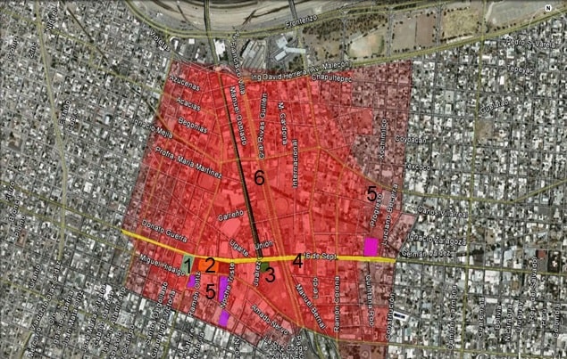 Mediante la figura 10, se retoman las delimitaciones espaciales sobre el CHCJ realizadas por los actores del grupo 1, donde se destacan los elementos simbólicos que los propios participantes señalaron y, que posteriormente se digitalizaron: En color negro (6) la Av. Juárez, en verde la ex – aduana (Museo de Revolución en la Frontera MUREF) (3), en naranja la misión de Guadalupe y catedral (2), en cian la ex – presidencia (1), en amarillo la Av. 16 de septiembre (4) y en morado los mercados Cuauhtémoc, Reforma, Hidalgo y Juárez (5).