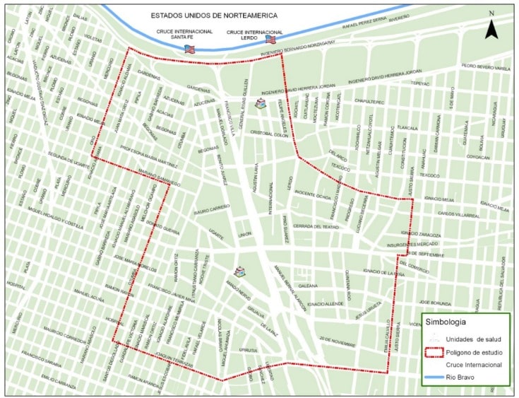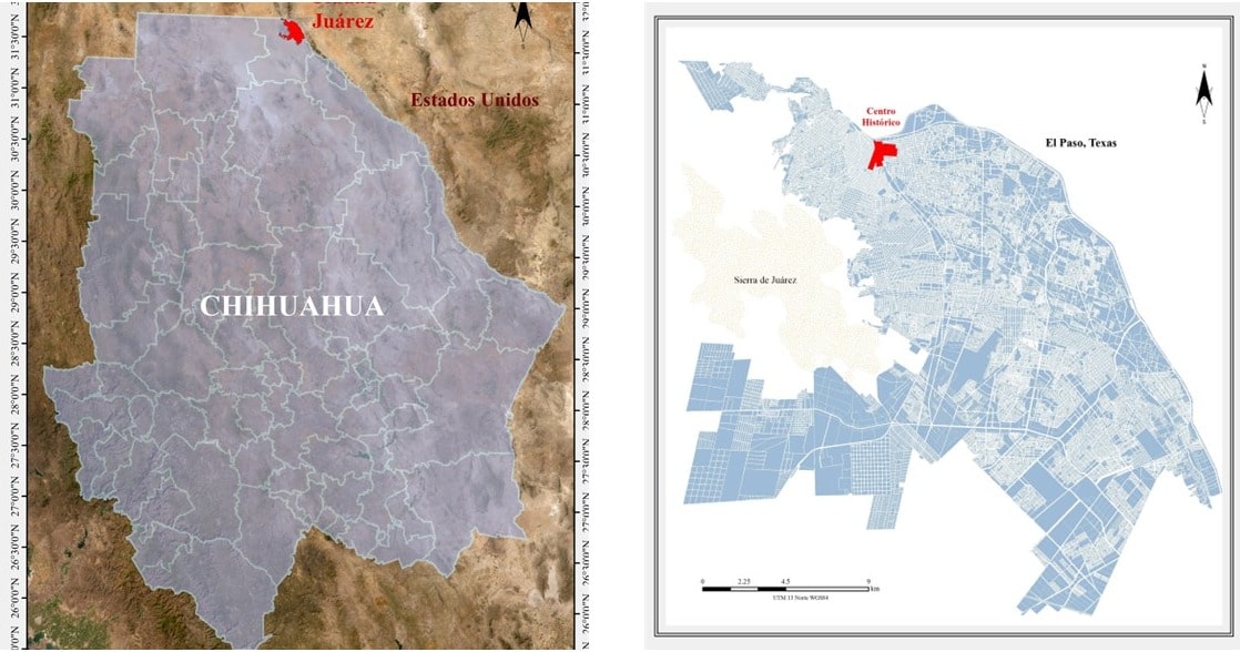Ciudad Juárez se ubica en el estado fronterizo de Chihuahua al norte de México; su centro se localiza al norponiente de la ciudad, lejos del centro geográfico del centro de población. Entre sus características de fundación, el centro en sus inicios se conformó por la edificación de la Misión de Nuestra Señora de Guadalupe de Mansos del Paso del Río del Norte (Paso del Norte), en el año 1659, por Fray García de San Francisco quien siguió el modelo tradicional de los asentamientos fundados por españoles. Asimismo, el centro en la actualidad es un área limítrofe hacia el norte con Estados Unidos de América (EUA) vinculada mediante los puentes internacionales Santa Fe y Lerdo (ver figura 1).