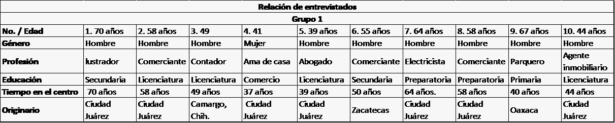 “…Yo llegué joven a Juárez…y mucho de lo que, pues tengo aquí, he vivido aquí en lo que viene siendo el callejón (en la zona centro), entonces este pues ya en mis cuarenta y tantos (años) viviendo aquí, pues hay cosas que son este pues si parte de lo que uno hace, antes ya hace años cuidaba yo carros en la Juárez, también le salía ahí cuando no trabajaba, pero ya le estoy hablando de hace años, me tocó lo mero bueno de la Juárez de eso me acuerdo bien…” (Participante 9, grupo 1).