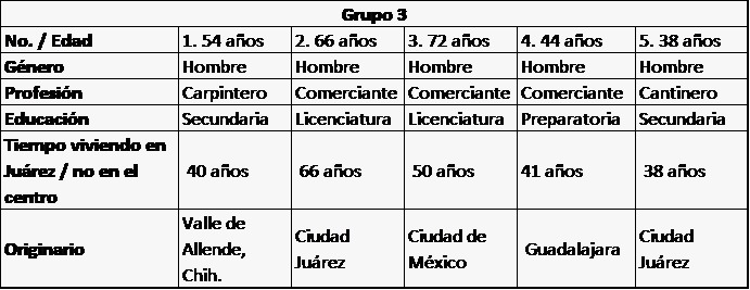 “…La Juárez era el lugar en donde todo mundo iba, era otro ambiente, pero también Juárez era diferente…nada de eso quedó…nomas algunos edificios, pero pues apenas y se parecen…yo por ejemplo les platico a mis hijos cuando cruzamos al paso (Texas) por la Juárez, que ahí era un lugar a todo dar, siempre me encontraba con los chavos del barrio ahí…” (Participante 3, grupo 3).