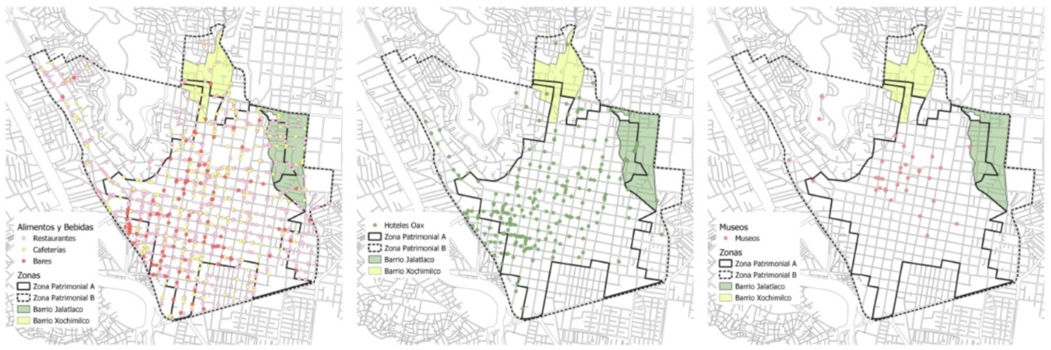 ii) Los establecimientos dirigidos al turismo. Los hoteles en Oaxaca tienen registro desde la década de 1960, y ayudaron a mejorar los servicios básicos en la zona. Para 2020, el municipio tiene 342 hoteles, y el 63% se ubica en el CH; por otra parte, Airbnb en el municipio tiene más de 2 mil alquileres, “Airbnb actúa como agente que acelera dinámicas asociadas al proceso de gentrificación” (Madrigal, et al., 2018). El CHO concentra 1,205 establecimientos de alimentos y bebidas. La ciudad es rica en herencia culinaria y se transforma con las nuevas tendencias gastronómicas, por tanto, se genera una fusión de tradiciones que se mezclan con restaurantes de autor y mezcalerías. “La gastronomía y el ocio” son parte de las nuevas estrategias de gentrificación que se utilizan para atraer turistas y población de altos ingresos debido a la imagen patrimonial e histórica, en donde se formula una nueva imagen de gastronomía de calidad que se ofrece al turismo (Quijano-Gómez, 2019).