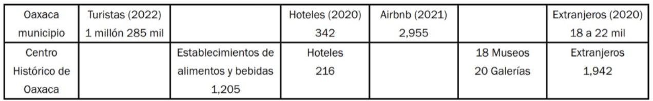El estado, en 2020, recibió a 3 millones de turistas; un año después a más de 5 millones; mientras que la capital recibió a más de 1 millón de turistas. Estos datos muestran que Oaxaca experimenta un proceso de turistificación, reflejo del aumento en el número de turistas, precisamente, que con el paso del tiempo amenazan los derechos de la población local y provocan el alza en el mercado de la vivienda y las propiedades, lo que causa la generación de diversas formas de desplazamiento.