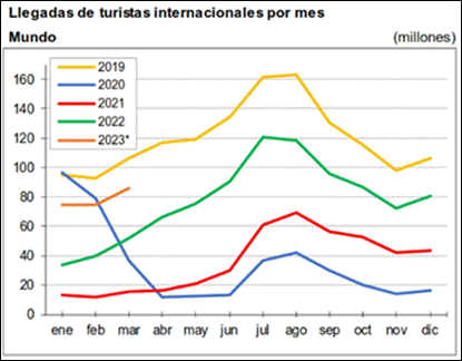 El turismo es una actividad de gran impacto global en la cultura. Hasta antes del 2019 (año de contingencia mundial por COVID-19), hubo un crecimiento sostenido que registró el desplazamiento de 1465 millones de turistas internacionales, cuyos ingresos en diversos países alcanzaron la cifra de $1494 billones de dólares americanos (USD). Al cierre de 2022 (plena recuperación postpandemia), la llegada de turistas en el mundo fue de 963 millones, 541 millones en países con economías avanzadas y 422 millones en países de economías emergentes (Figura 1). La derrama económica que se generó fue de 1,031 billones de USD (UNWTO, 2023, pp. 6-7).