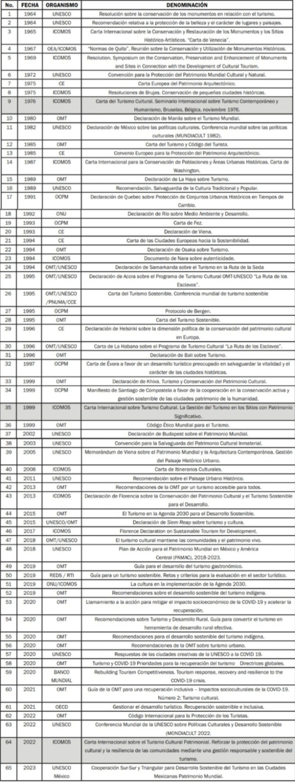 La UNESCO, desde 1972, y sus organismos consultivos como el ICOMOS y la Unión Internacional para la Conservación de la Naturaleza (WWF) han manifestado persistentemente su interés y preocupación por el patrimonio y su vinculación con el turismo. Desde 1962, se destaca la campaña internacional para la salvaguarda del patrimonio de Nubia en Egipto (UNESCO, 1980) que, posteriormente, sirviera como motivación común entre países para formación de la CPMNyC (Villaruel, 2021). En la Tabla 1, se presenta una relación cronológica de la mayor parte de los documentos teóricos: cartas, recomendaciones doctrinales y manuales de organismos internacionales de 1965 a 2022[1].