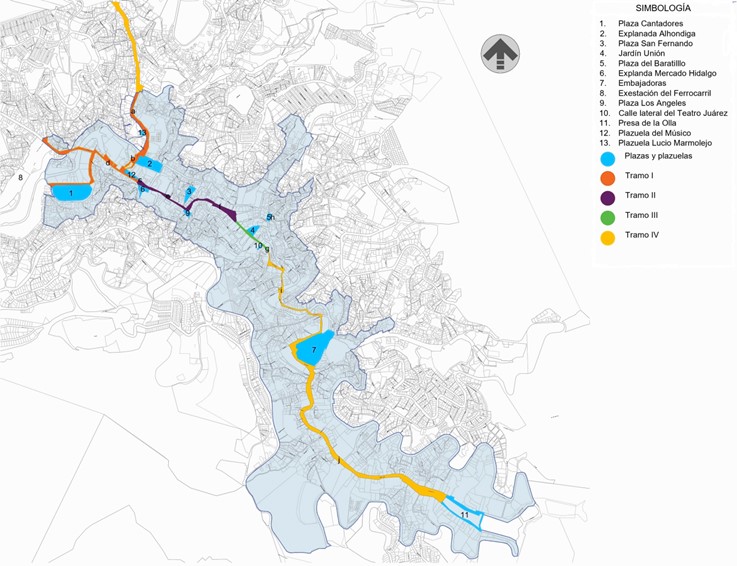 Aunque el estudio comprende en este tramo las calles de Sopeña, Manuel Doblado, Sangre de Cristo, Paseo Madero, Embajadoras y Paseo de la Presa y el Jardín Unión, calle lateral al Teatro Juárez, Plaza Baratillo (figura 2), Embajadoras y Presa de la Olla, en este artículo sólo se describen y analizan las secciones III-g y III-h. debido a que el tramo III-i está en proceso de análisis.