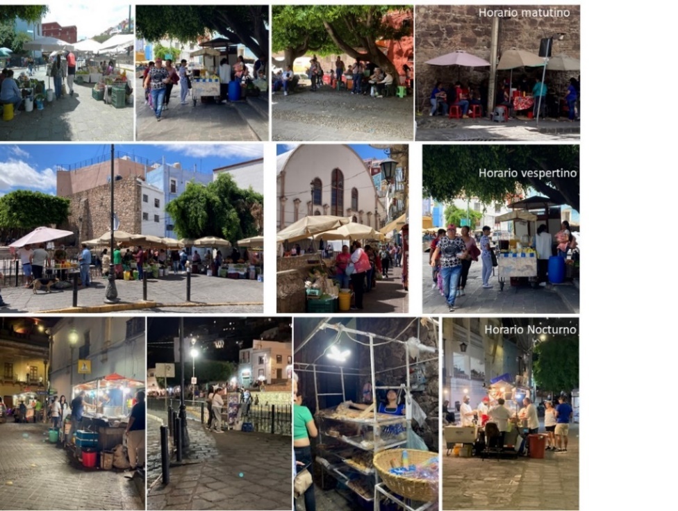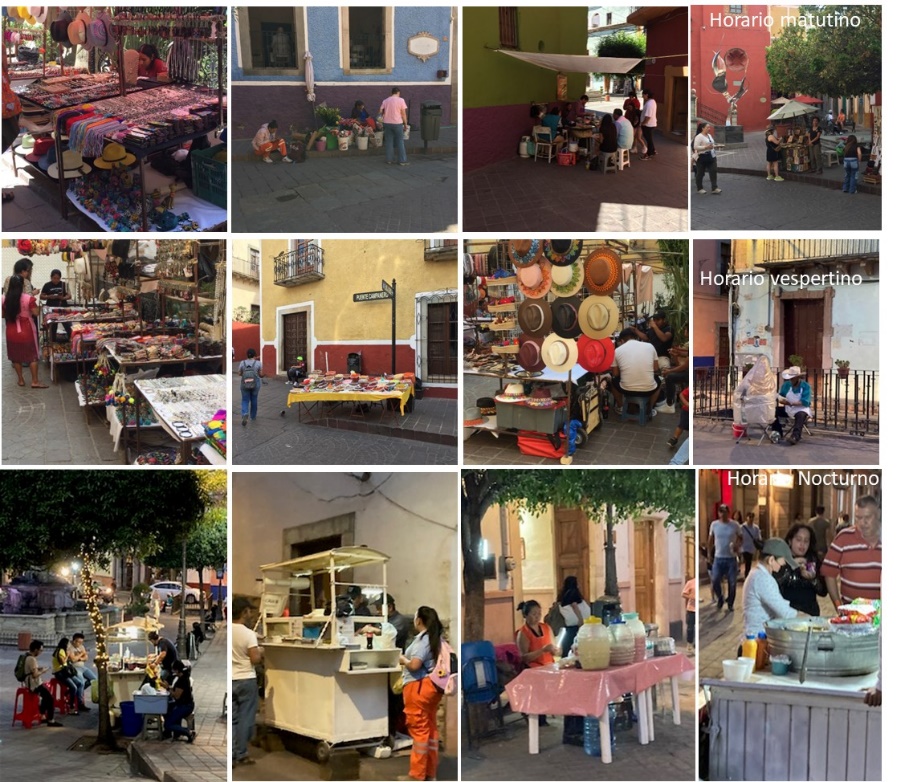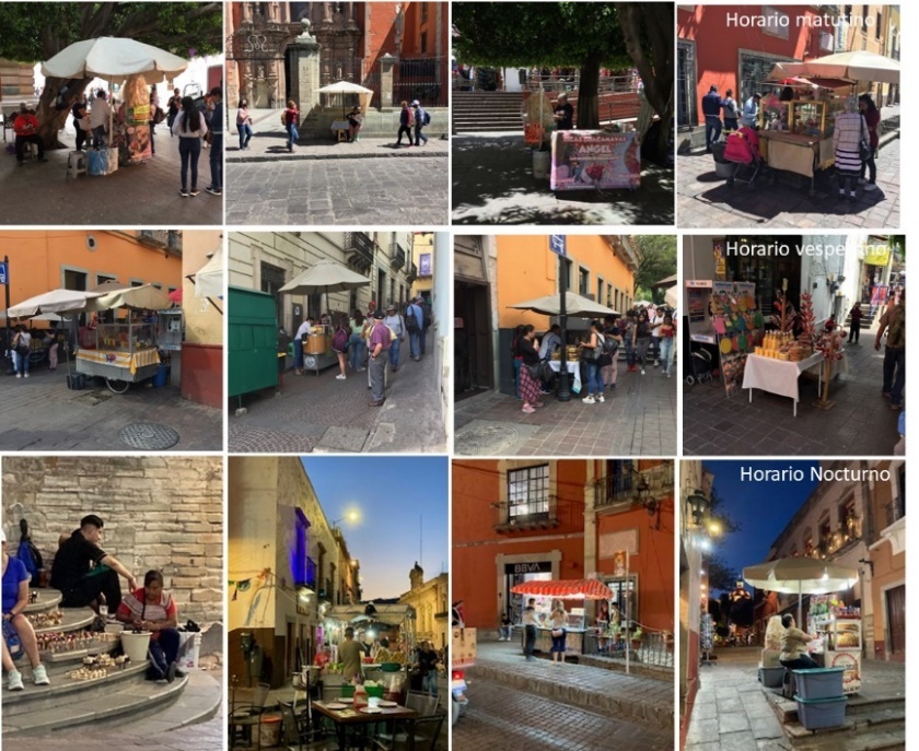 La observación de las prácticas comerciales se realizó de lunes a viernes, en un período de 24 horas, y aunque algunas de las actividades que se efectúan en el espacio urbano patrimonial de la centralidad histórica de la ciudad de Guanajuato se hacen de manera continua desde la mañana hasta la noche, los resultados se presentan a partir de tres horarios definidos: matutino, vespertino y nocturno. El primero abarca de las 8:00 hasta las 12:00 horas; el segundo de las 12:00 a las 18:00 horas, y el último hasta las 24:00 horas. En estos tres períodos se identificó la prevalencia de género en los vendedores que atendían los puestos en los distintos tramos y sección de la delimitación espacial descrita en el apartado anterior.