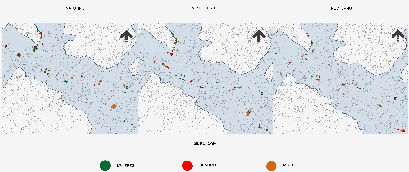 En los mapas de la figura 6 se aprecia la ubicación de los puestos y el género de los comerciantes que los atienden, También se observa cómo la concentración matutina de comercios en el tramo I se va diluyendo por las tardes, y en la noche ya están dispersos. En los tramos II y III, los puestos disminuyen considerablemente por la tarde y la noche. También se aprecia gráficamente el incremento de comercios atendidos por hombres y mujeres, y su ubicación.