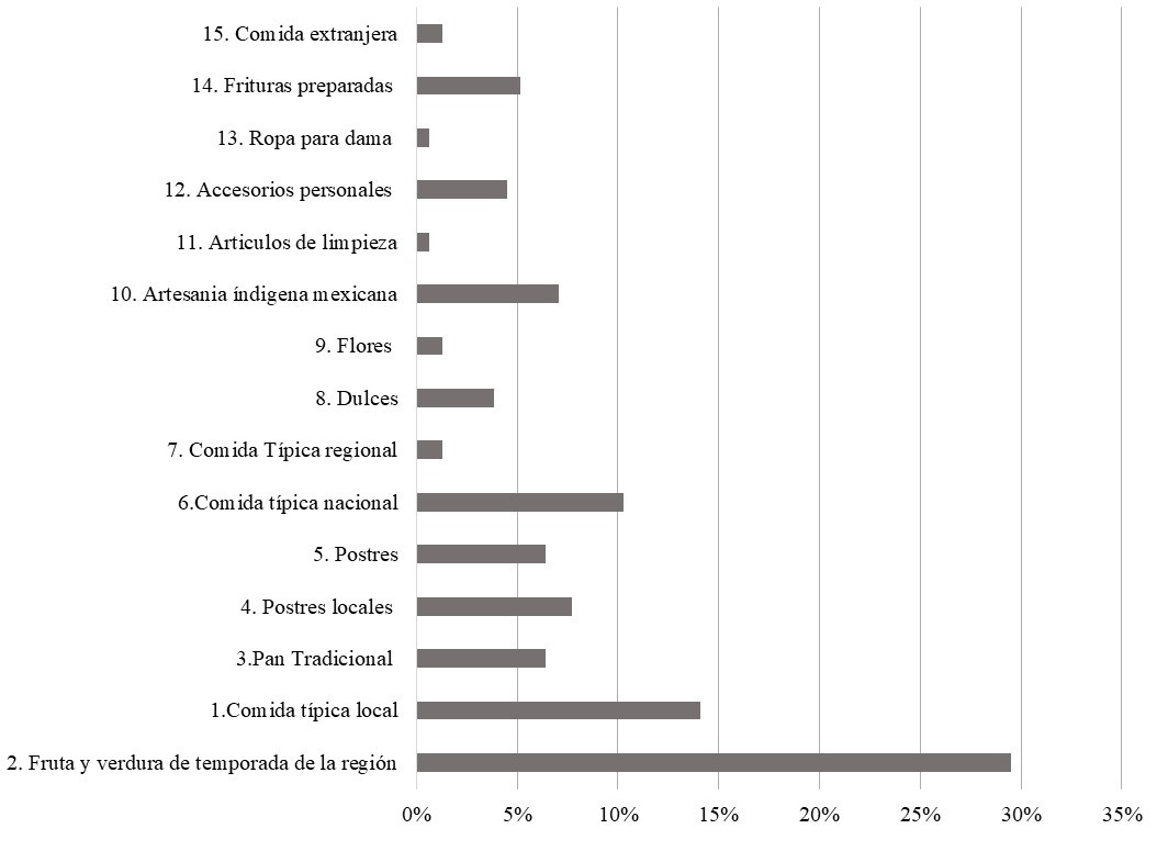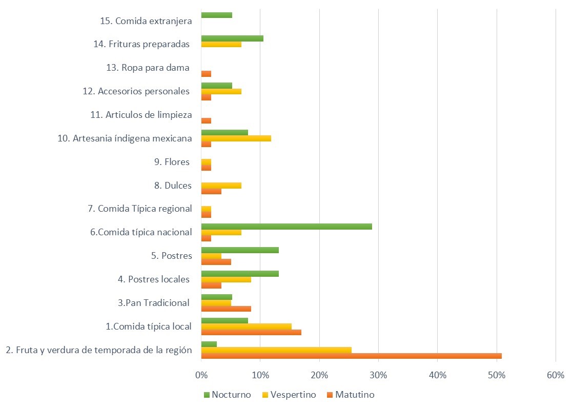 Aunque los datos dan cuenta del comportamiento diferencial en los tres horarios observados, al comparar los resultados (tabla 3) se encontró que el comportamiento del tipo de productos que se ofertan en los puestos prevalece (figura 8). Los seis principales se relacionan con la venta de verdura y fruta de la temporada y con la elaboración de alimentos típicos tradicionales, pan, postres locales y venta de comida típica nacional (tacos, tamales (ver primeras seis filas de la tabla 3); seguidos por la venta de comida típica regional, dulces, flores (filas intermedias de la tabla 3).