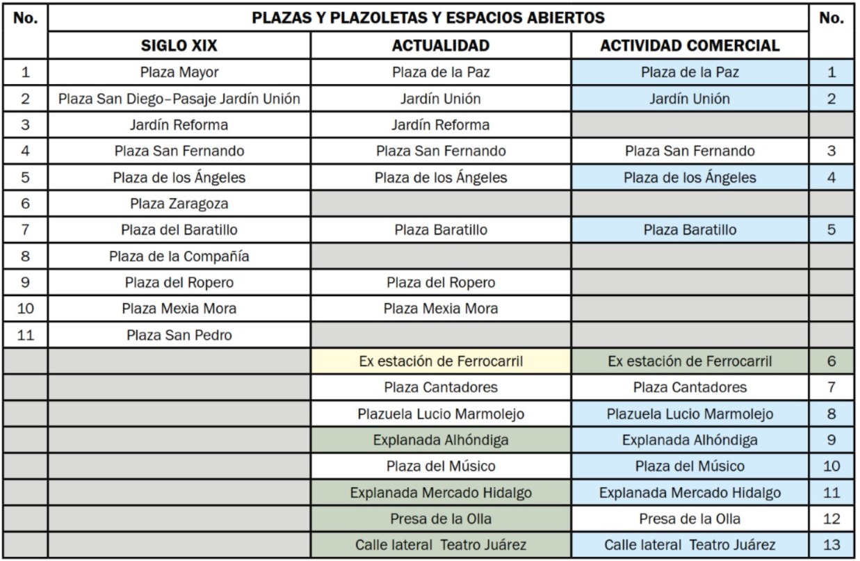 Para determinar las calles y plazas muestras para el estudio, se consideró que de las trecientas calles y callejones y de las veinte plazas y plazoletas del casco histórico registradas en el siglo XIX (Marmolejo, 2015), algunas de ellas han desaparecido, otras se han modificado y otras más se crearon a partir del crecimiento y las trasformaciones urbanas de la ciudad. En la actualidad, existen once plazas y plazoletas, y cinco espacios que han modificado su uso original: la explanada de la Alhóndiga, la explanada del Mercado Hidalgo, la ex estación de Ferrocarril, la calle lateral al Teatro Juárez, y la Presa de la Olla, los que junto con las plazas ya existentes constituyen el universo de este tipo de espacios. La muestra del estudio se integró con aquellos espacios en los que se realizan actividades comerciales de manera cotidiana (tabla 1).