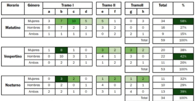 Se encontró que, por las mañanas, las mujeres comerciantes representan el 57.63%, focalizándose sus actividades en el tramo I, secciones b, c y d. (figura 3). La presencia de hombres comerciantes representa un 27.12% del total de los puestos que se encuentran en la vía pública. Un 15.25% de los puestos matutinos son atendidos por ambos géneros. (Tabla 2).