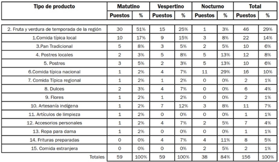Por las noches se diluye la presencia de platillos típicos locales (se reduce a la mitad), de venta de fruta, verdura, guisados, entre otros (de un 51% de presencia en las mañanas, por las noches sólo está presente en un 3%, reduciéndose 5.8 veces), dando paso a la predominancia de la comida típica tradicional nacional como los tacos (29%) y los postres en general (13%). Este cambio de productos se relaciona directamente con la disminución de las mujeres comerciantes en el horario nocturno; con las condiciones de inseguridad, con el incremento de la atención de los puestos por parte de ambos géneros y por más de una persona, así como por el tipo o perfil de clientes que frecuentan los comercios en este horario.