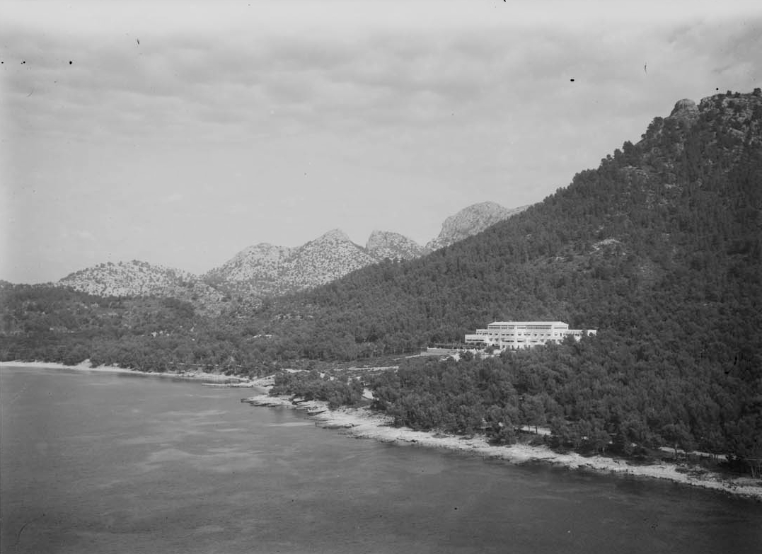 En esta primera fase, los espacios dedicados al turista son escasos. En el siglo XIX se reducen a establecimientos tradicionales, en ocasiones casas particulares. En 1903 se inaugura el Gran Hotel de Palma, del arquitecto modernista catalán Lluís Domènech i Montaner, el primer gran hito de la arquitectura turística en Mallorca (Seguí Aznar, 2001, pp. 29-32). En 1929, el empresario argentino Adan Diehl construye el hotel Formentor en la península del mismo nombre, en el norte de la isla (Lladó Pol, 2022), un paraje aislado que pronto se convertirá en foco de reunión de artistas, intelectuales, políticos y otras personalidades (Figura 1). En los años 30 abrirán sus puertas otros equipamientos más humildes, la mayoría dependientes de estilos tradicionales e historicistas, y de dimensiones moderadas.