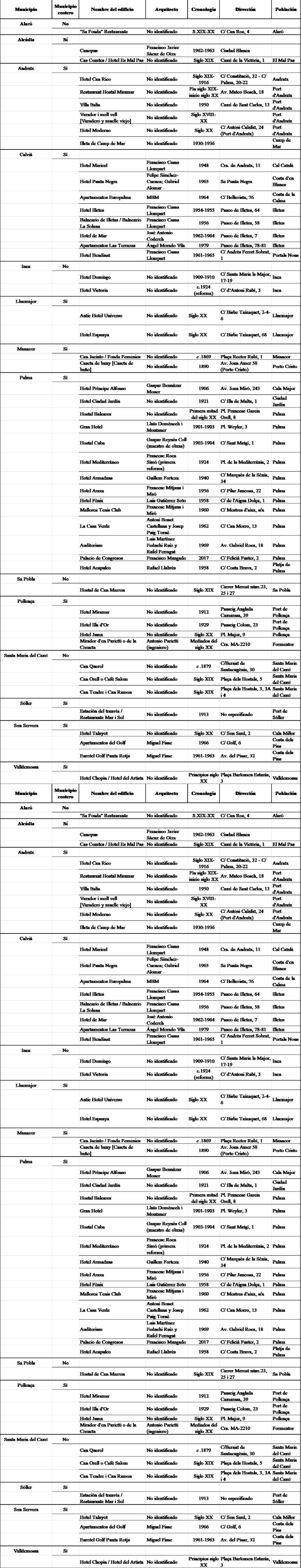 De los 35 catálogos municipales consultados, 14 tienen arquitecturas turísticas (Figura 2). En éstos, se han contabilizado un total de 50 obras vinculadas con el alojamiento y el entretenimiento del visitante, que se han recogido en una tabla en la que se indican sus datos básicos de identificación y localización (Tabla 1). Se han recogido edificaciones de uso colectivo que, especialmente en el siglo XX, supusieron una verdadera renovación tipológica para el transporte, alojamiento y ocio del turista. Esto implica dejar de lado casas de veraneo, al entenderse que no se trata sino de una adaptación de la tipología de vivienda. A pesar de ello, hay que resaltar la catalogación de proyectos en urbanizaciones turístico-residenciales de nueva planta, como Cala d’Or (1933) en el término municipal de Santanyí, y la Costa de los Pinos (1957) en Son Servera. Los catálogos de los municipios de Calvià, Palma y Pollença protegen segundas residencias en áreas más dispersas.
