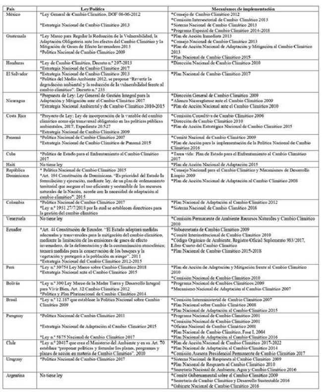 En ese sentido, las buenas prácticas y la vinculación con la sociedad muestran resultados positivos en materia de adaptación. Tenemos algunos casos: en Brasil se realizó un proceso participativo y de consulta pública para la elaboración del Plan Nacional sobre Cambio Climático en el año 2008; en Argentina actualmente se están realizando consultas regionales a la sociedad civil y coordinación intersectorial; en Chile se creó la Agencia Chilena de Eficiencia Energética y una ley que exonera de impuestos a las personas que instalen colectores solares para agua caliente en viviendas nuevas; en Cuba está en curso el macroproyecto “Escenarios de peligro y vulnerabilidad de la zona costera cubana”, asociado al ascenso del nivel medio del mar para los años 2050 y 2100; en México el “Portal sobre adaptación al cambio climático” contiene información sobre las políticas nacionales, proyectos, medidas y acciones para que la ciudadanía tenga acceso a la información sobre el tema (Portal Regional para la Transferencia de Tecnología y la Acción frente al Cambio Climático en América Latina y el Caribe [Regatta], 2017). Por lo pronto, se presenta en la tabla 1 las leyes y los mecanismos de implementación para la adaptación ante el cambio climático en América Latina.