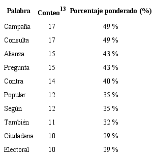 Si bien, la palabra “consulta “popular” se repite con mayor frecuencia en las publicaciones de El Comercio y El Telégrafo (ver anexos 1,2,3,4), para este último dicha palabra se convertirá en el evento más importante del país. “La consulta se aplicará de manera inmediata y obligatoria […]” (noticia 3, El Telégrafo). De igual manera, en el escenario de las atribuciones, la misma palabra aparece como extensión de cambio. “En la práctica, en caso de ganar el Sí, la parte intangible crecerá en 62.188 adicionales que se distribuirán en la zona norte del Parque, paralelo al ITT […]” (noticia 5, El Telégrafo).