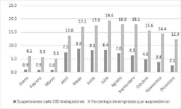 Como se aprecia en el gráfico 2, las suspensiones crecieron desde el inicio de la pandemia y comienza a bajar en el mes de agosto, aunque no regrese a los niveles previos. Así se pasó de un 0,8 % en marzo a superar el 8 % en mayo, y recién en agosto habrá una leve y paulatina caída hasta el 2,5 % de diciembre. Una trayectoria similar sigue el porcentaje de empresas que suspendieron trabajadores. Este porcentaje era del 5,1 % en marzo, que crece hasta alcanzar un pico de 19,4 % en julio y luego desciende hasta un 12,3 % en diciembre, el cual duplica el nivel de marzo.