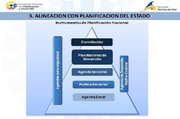 Otro factor que contribuye a la falta de planificación es que luego de la publicación de las PNOC no se han ejecutado las acciones necesarias para su puesta en marcha, por lo que es necesario elaborar un plan de acción multisectorial que permita su implementación como elemento de gestión. En el gráfico 1 se puede apreciar el alineamiento de los elementos de la planificación nacional vigentes en Ecuador, dentro de los cuales se encuentra un instrumento transversal y de carácter interinstitucional denominado Agenda de Desarrollo Marino Costera, el cual hasta la presente fecha no se encuentra elaborado ni está en vigencia.