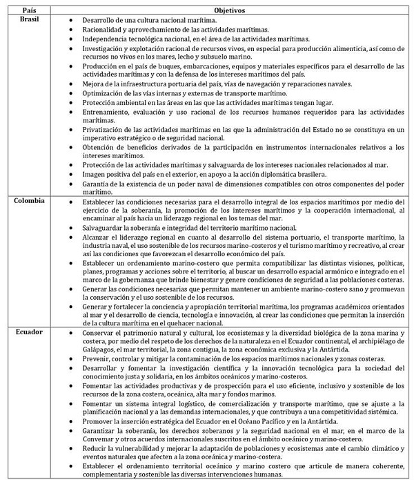 Otra diferencia, con respecto a Ecuador, es que tanto Brasil como Colombia incluyen en sus políticas la creación de una cultura o conciencia marítima, la cual contribuye en la gestión exitosa de los espacios marítimos y sus actividades. También incluyen políticas orientadas al desarrollo de la industria naval, situación no considerada en las PNOC del Ecuador.