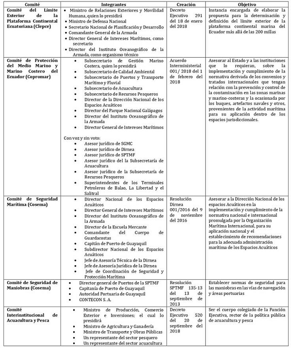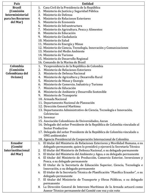 En Ecuador, mediante Decreto Ejecutivo 990 del 29 de diciembre de 2011, se crea el Comité Interinstitucional del Mar (CIM) como un ente de aprobación de política pública intersectorial del mar, articulación y seguimiento, en el marco de la planificación y desarrollo nacional. Su conformación y atribuciones han sido modificadas en más de una oportunidad, siendo la más reciente mediante Decreto Ejecutivo 1197 del 20 de noviembre del 2020. En la tabla 2 se observan los integrantes de los órganos gubernamentales encargados de cada país junto con las entidades y autoridades que lo conforman.
