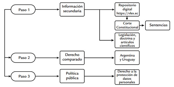 De esta manera el estudio se desarrolló en tres pasos metodológicos (gráfico 1). En el paso 1 se trabajó con información secundaria obtenida desde el repositorio digital https://vlex.ec/, en el que se obtuvo jurisprudencia vinculante mediante las sentencias de la Corte Constitucional: Resolución Nro. 19-9-SEP-CC, Resolución No. 1-14-PJP-CC y Resolución 182-15-SEP-CC, que son las que mejor han desarrollado el derecho a la protección de los datos personales. Además, se revisó la legislación, doctrina y artículos científicos relacionados con el tema de protección de datos personales. Mediante el paso 2 se realizó un estudio de derecho comparado con los países de Argentina y Uruguay, se los escogió por ser los dos países de la Comunidad Andina que han recibido por parte de la Unión Europea reconocimiento internacional con respecto a un manejo adecuado de la protección de datos personales. Por último, en el paso 3, con base en el análisis de los pasos anteriores se analizó en Ecuador el derecho a la protección de datos personales, tomando en cuenta la política pública “Por una internet segura para niños, niñas y adolescentes” (arcotel.gob.ec), definida como la primera política de la región que previene y mitiga riesgos en las redes sociales usadas por niños, niñas y adolescentes, considerados por el Estado ecuatoriano como personas y grupos de atención prioritaria.